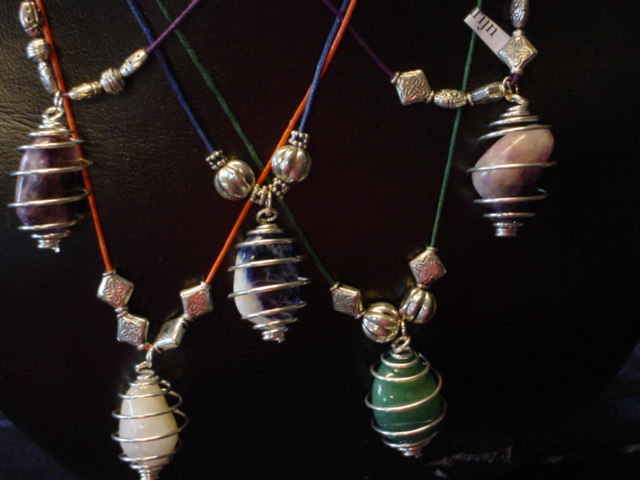 9: Diverse modellen spiraal hangers in combinatie met tibetaans zilveren kralen. Aan gekleurd waxkoord en met verzilverd veerslotje. Iedere ketting is uniek. Voor iedere steensoort mogelijk, spriaalhangers zonder steen ook verkrijgbaar.