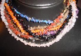 Doorboorde stoere stenen met geknoopt waxkoord. In verschillende soorten edelsteen. o.a. Bergkristal, Rozenkwarts, Tijgeroog, Sodaliet, Goldfluss, Hematiet, Maansteen, Amethist etc.