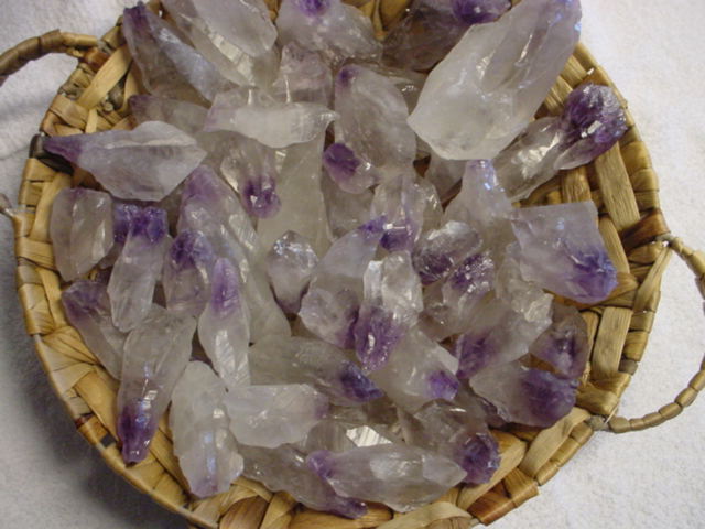 Nr.9 Ruwe bergkristal-amethist punten. Mooie bijzonder gevormde punten en brokken bergkristal met een paarse amethist punt. In verschillende maten en gewichten.