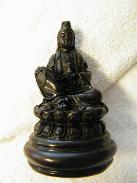 16: Kwan Yin, zittend, rood/bruine resin, ca. 10 cm hoog