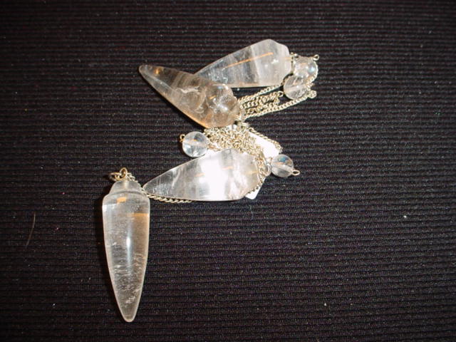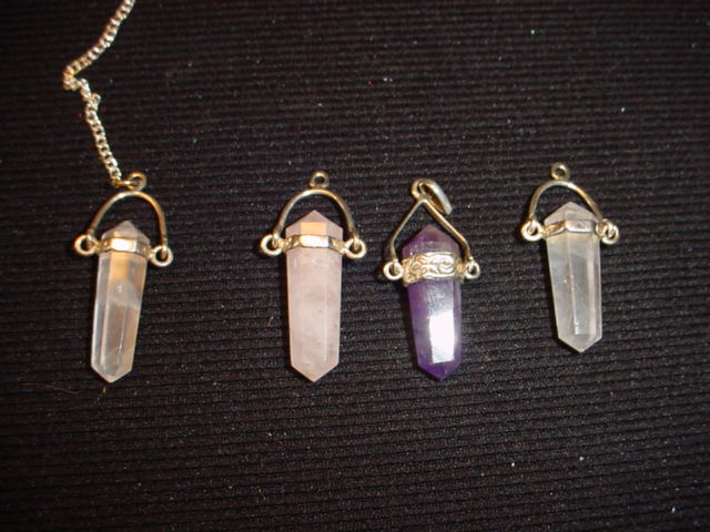 Hiernaast en hieronder volgen een aantal zeer bijzondere mooie pendels, met RUWE BERGKRISTAL punt of HONING CALCIET punt.