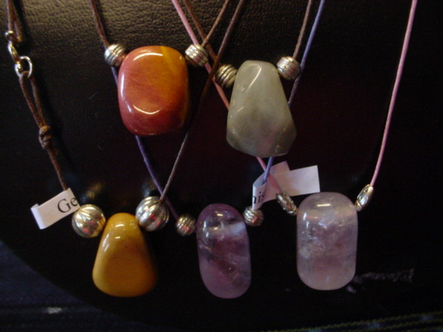 Doorboorde stoere stenen met geknoopt waxkoord. In verschillende soorten edelsteen. o.a. Bergkristal, Rozenkwarts, Tijgeroog, Sodaliet, Goldfluss, Hematiet, Maansteen, Amethist etc.